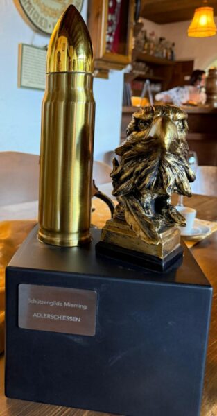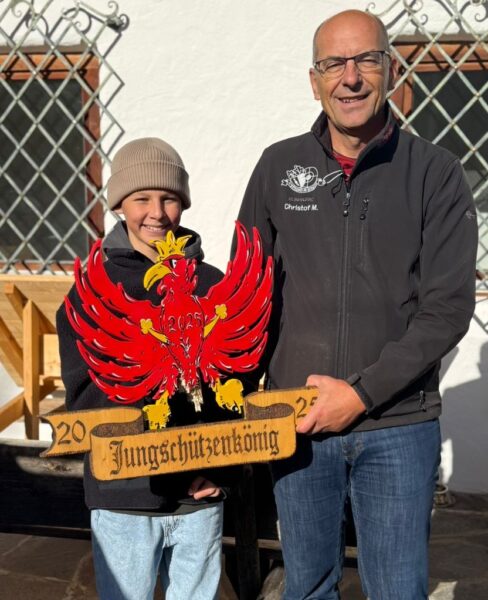 Bei den Erwachsenen ging es ein bisschen schneller. Hier waren exakt 153 Schüsse notwendig, bis der König feststand. Thomas Mössmer war es, der den entscheidenden Treffer landete und wurde damit Schützenkönig 2025. Neben der Schützenkette konnte er erstmals auch eine besondere Trophäe in Empfang nehmen. Pepi Puelacher gestaltete eine perfekt für dieses Adlerschießens passende Trophäe, die mit Namensschild versehen dann jedes Jahr an den neuen König übergeben werden kann.